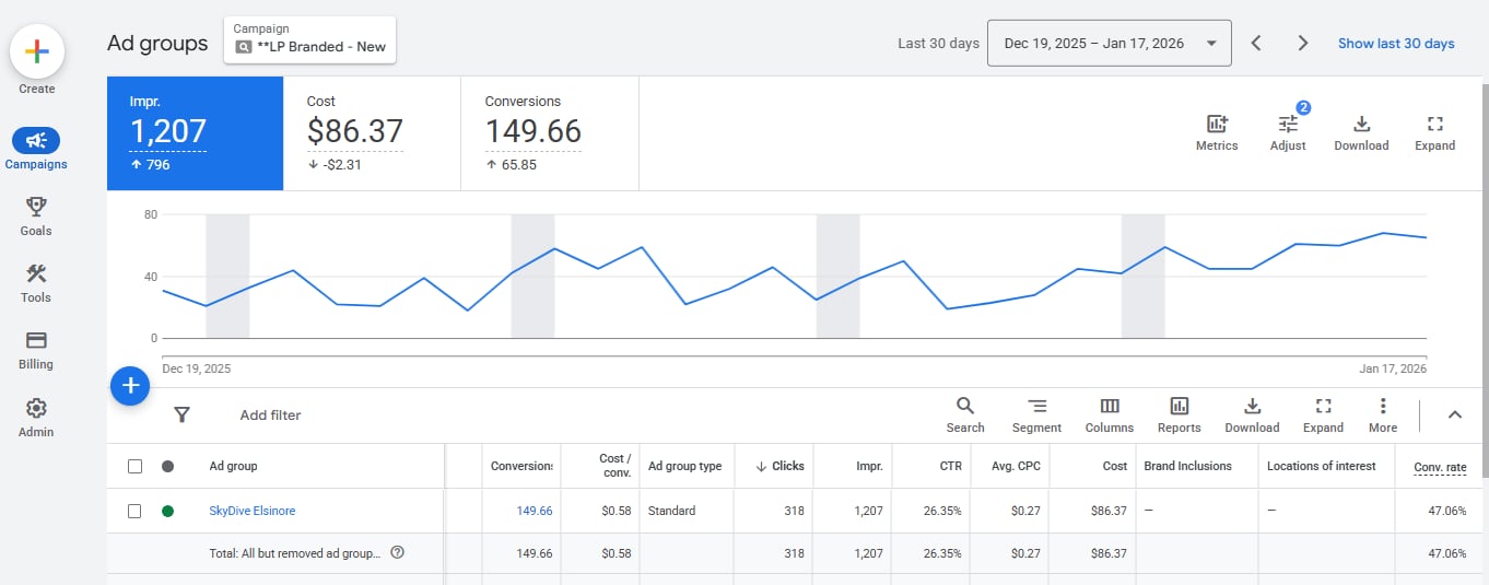 Skydive Elsinore, a premier skydiving destination in Southern California, required a sophisticated Google Ads strategy to scale their booking volume and optimize their marketing budget. The objective was to transform their digital advertising into a high-performance lead generation engine that captured high-intent traffic with maximum efficiency.